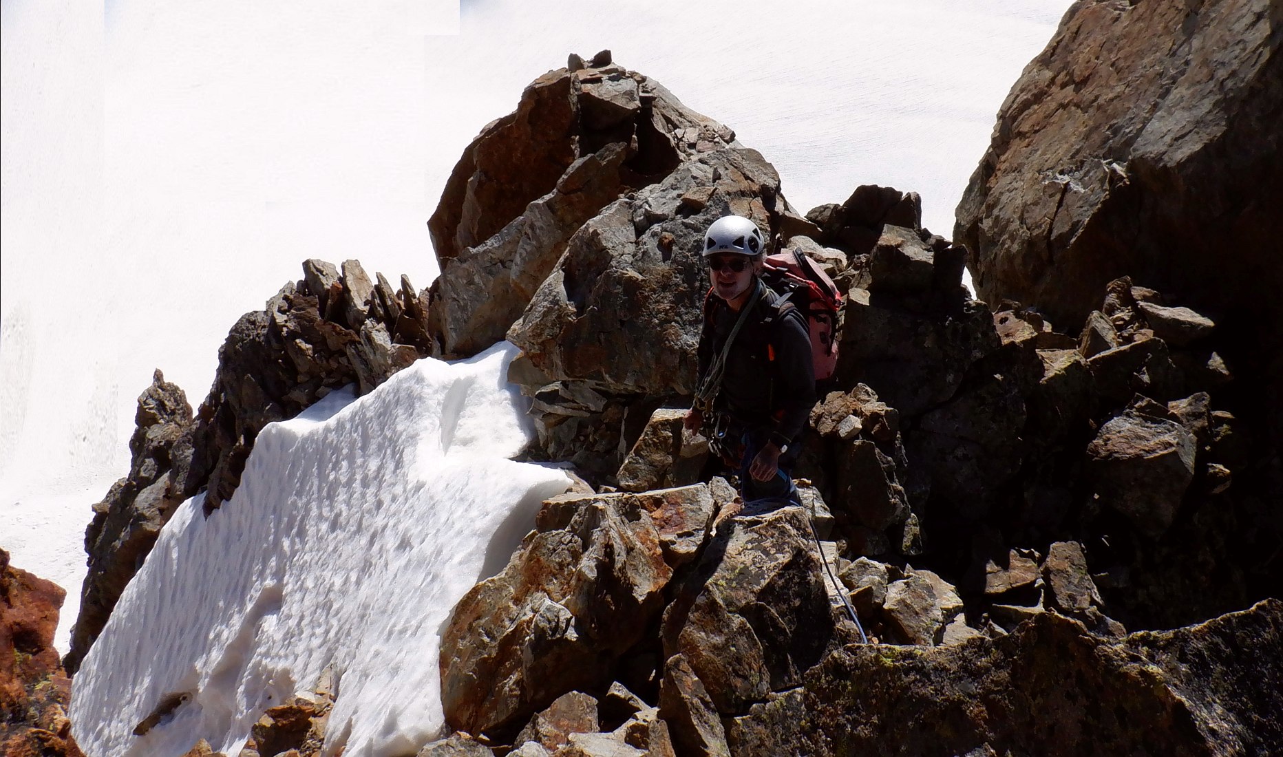 Belle escalade facile, granite rouge + neige, Arète Kuffner