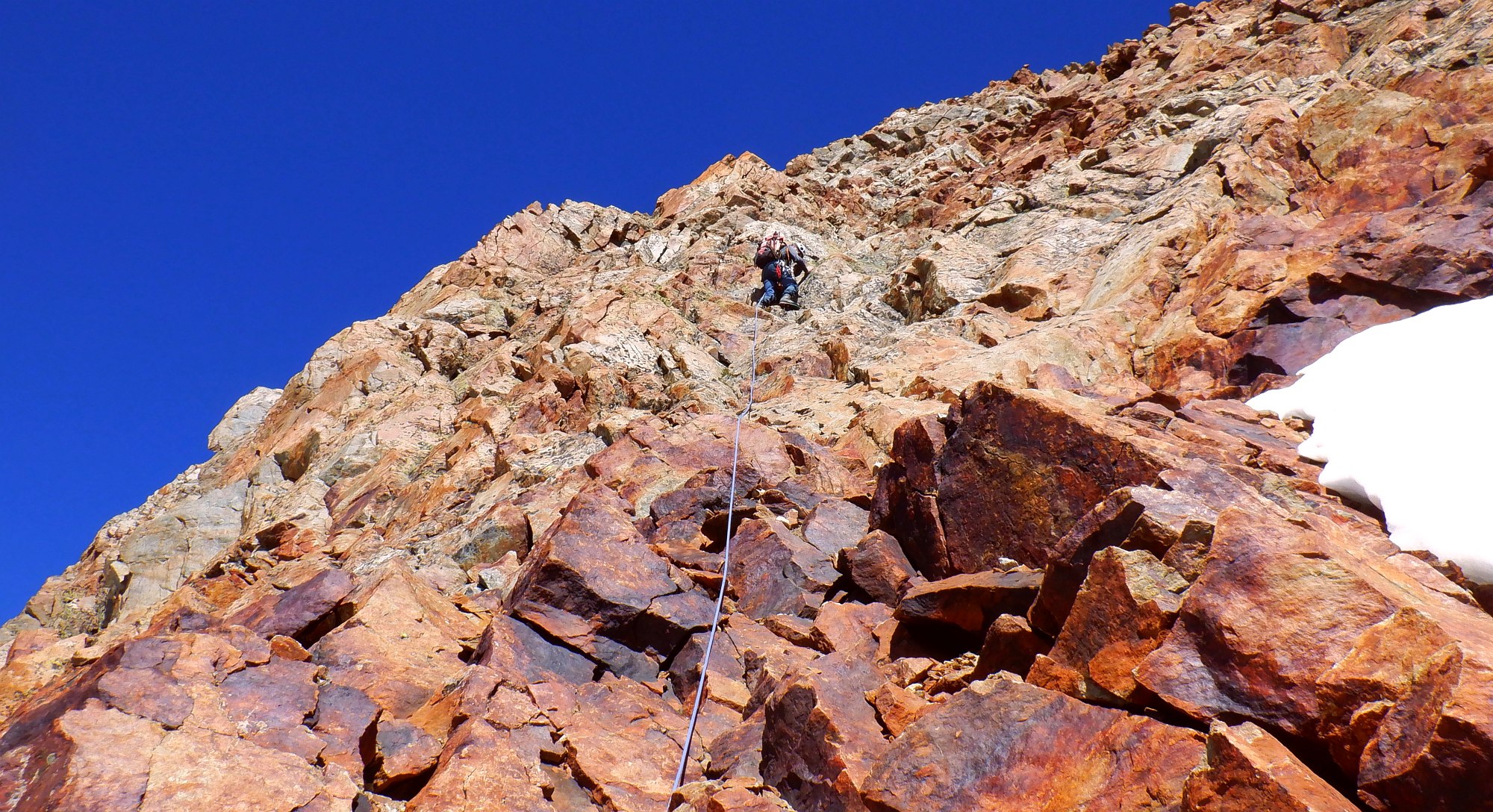 Belle escalade facile, granite rouge + neige, Arète Kuffner