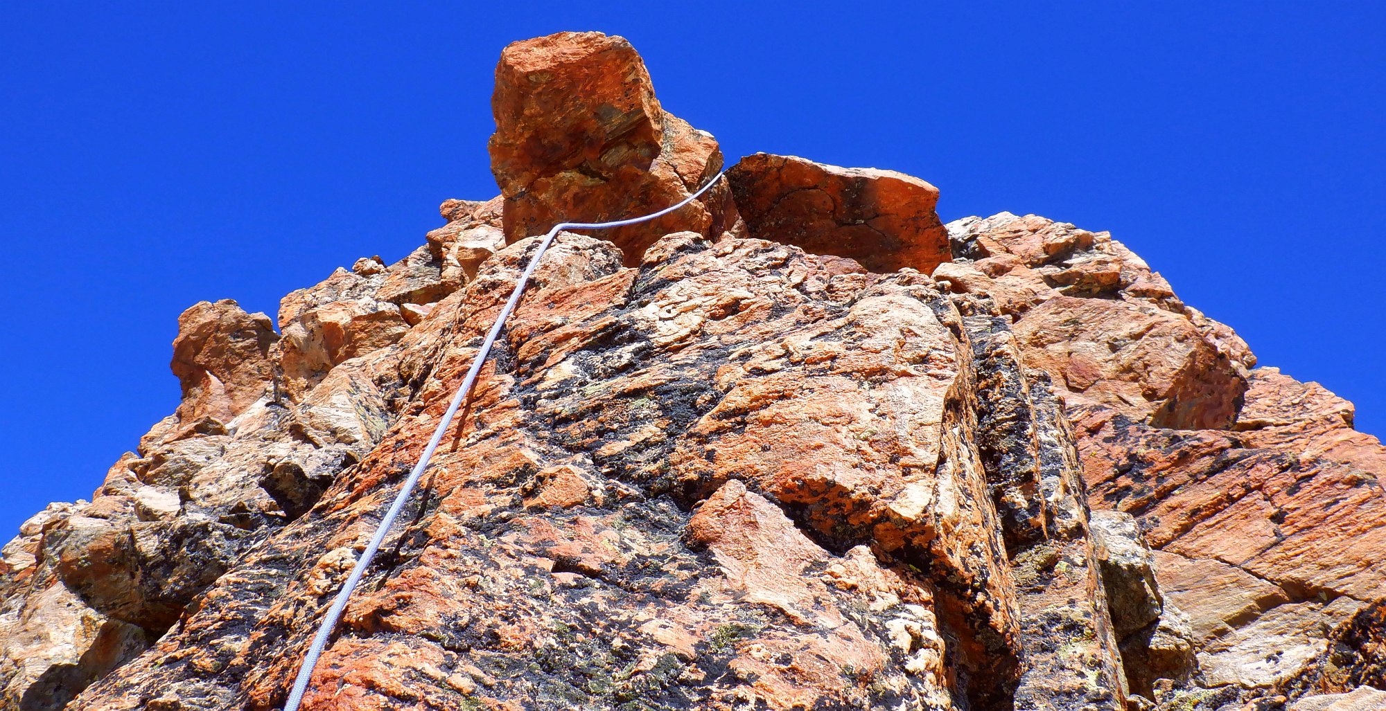Belle escalade facile, granite rouge + neige, Arète Kuffner