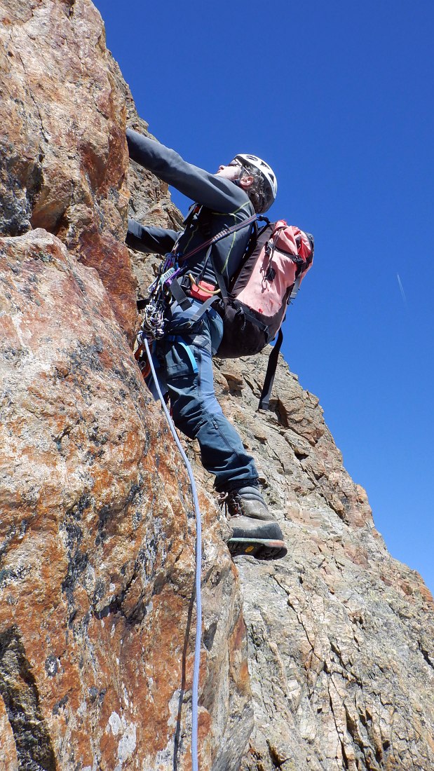 Belle escalade facile, granite rouge + neige, Arète Kuffner