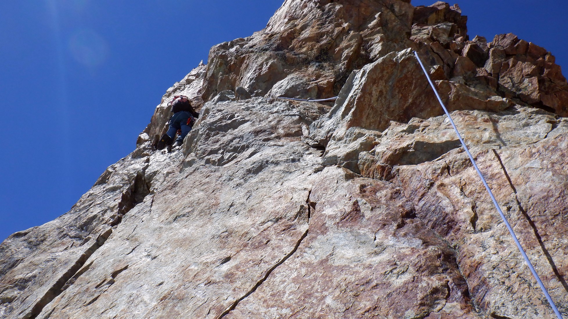 Belle escalade facile, granite rouge + neige, Arète Kuffner