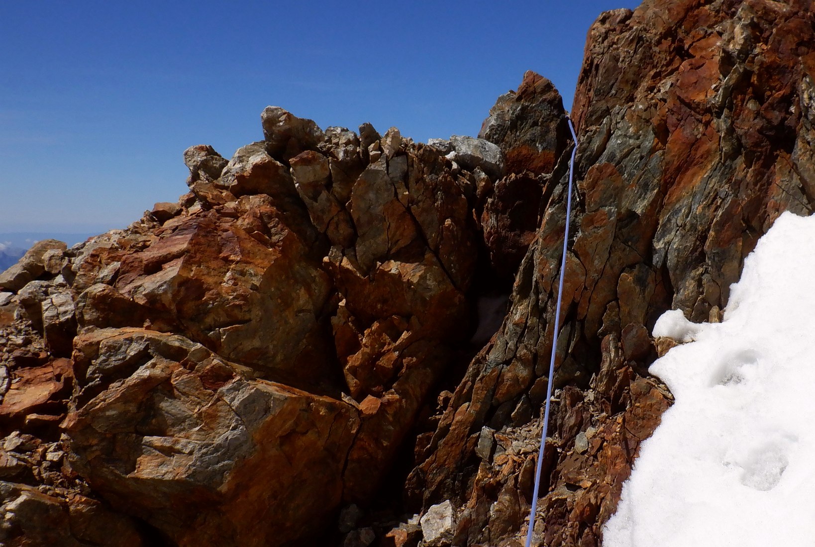 Belle escalade facile, granite rouge + neige, Arète Kuffner