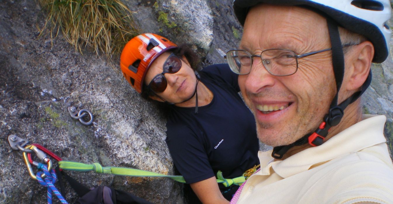 Denis Corpet et Annick Giraud escaladent la voie "Fleur de Rhodo" en face Est de la dent d'Orlu, 30 sept. 2009