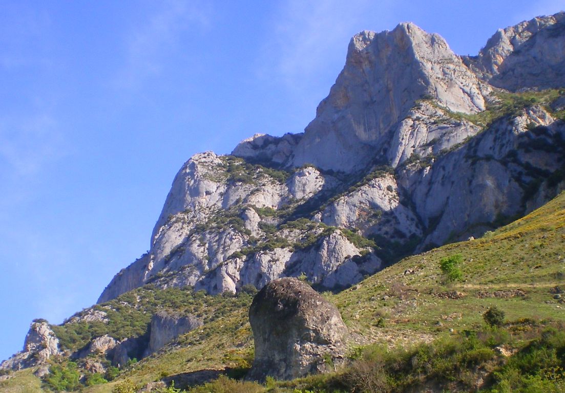 Great limestone rock, nice climbing cliff, wonderful view on snowy Pyrenees