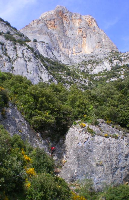 Great limestone rock, nice climbing cliff, wonderful view on snowy Pyrenees