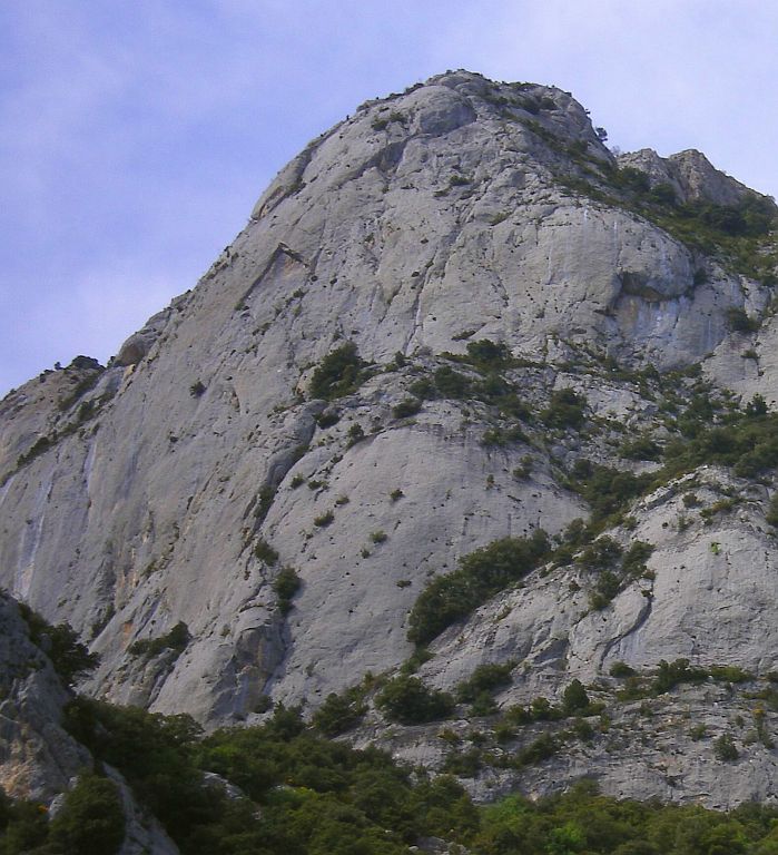 Great limestone rock, nice climbing cliff, wonderful view on snowy Pyrenees