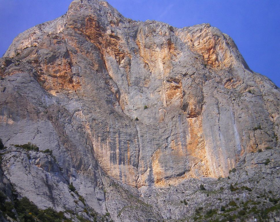 Great limestone rock, nice climbing cliff, wonderful view on snowy Pyrenees