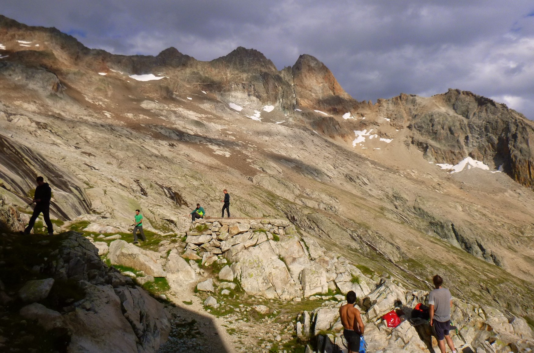 Escalade face Ouest tête du Rouget, voie Centrale Parat, TD- non équipée. Denis Corpet et Noël Dupré la Tour, 4 aout 2017. Refuge du Soreiller, les Etages, Massif des Ecrins Oisans, Isère, France