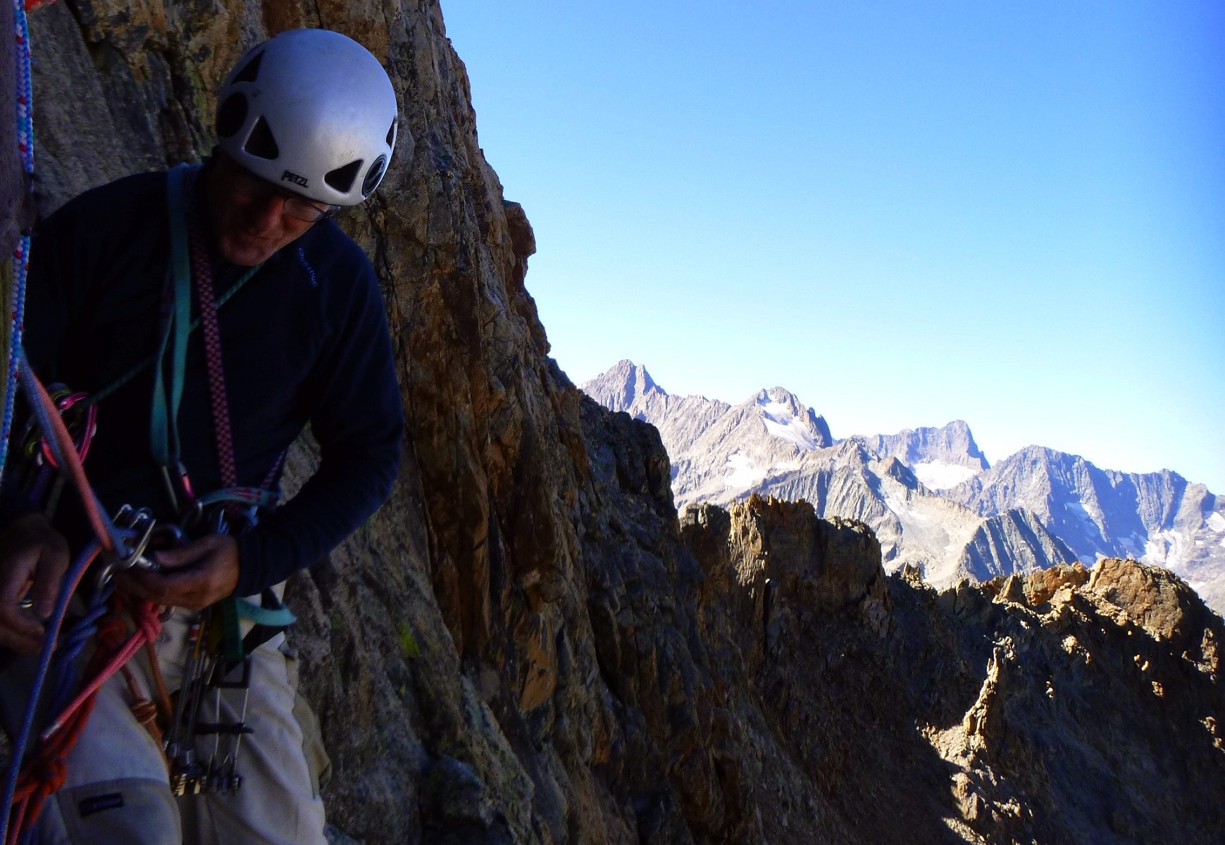 Escalade face Ouest tête du Rouget, voie Centrale Parat, TD- non équipée. Denis Corpet et Noël Dupré la Tour, 4 aout 2017. Refuge du Soreiller, les Etages, Massif des Ecrins Oisans, Isère, France