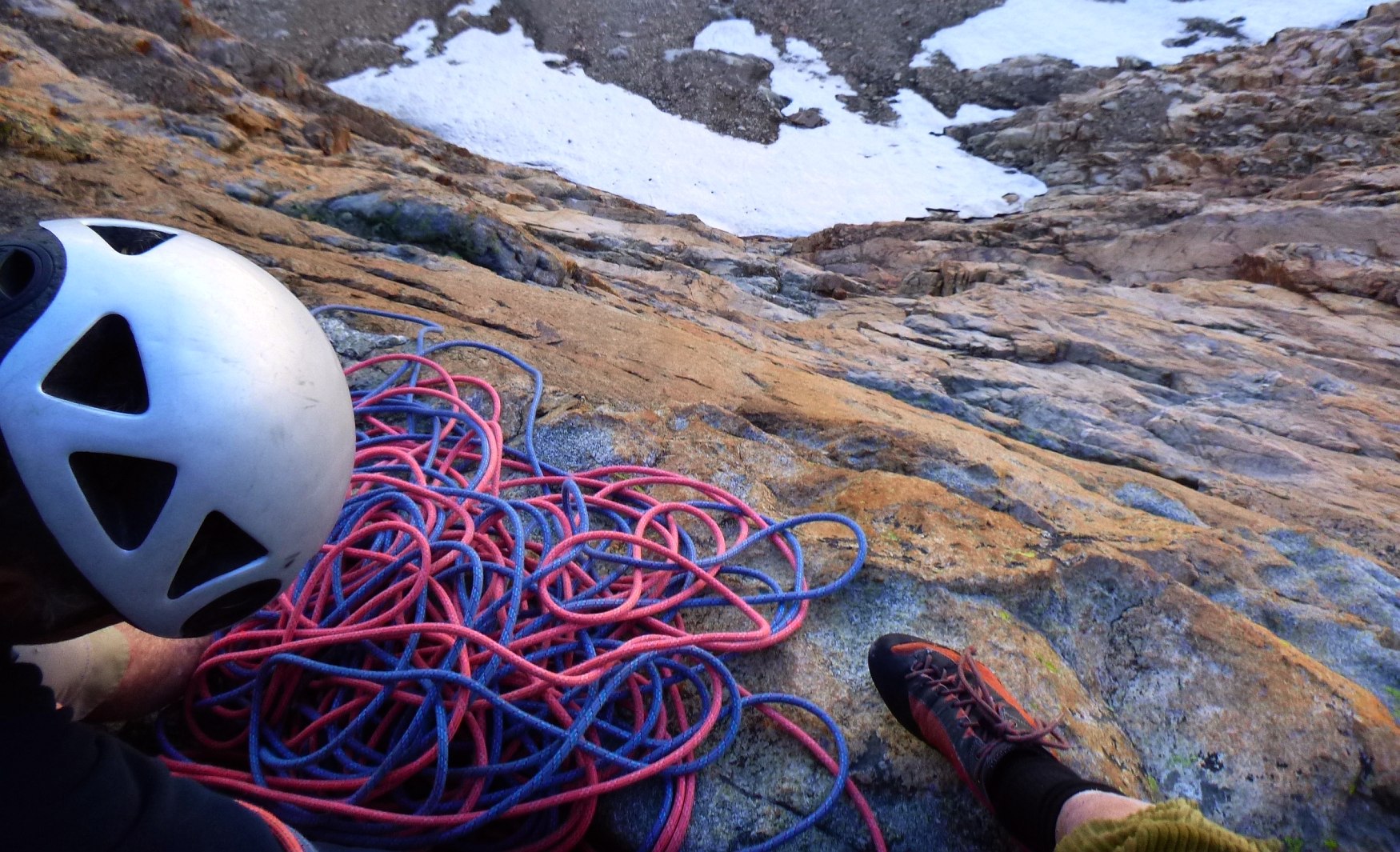 Escalade face Ouest tête du Rouget, voie Centrale Parat, TD- non équipée. Denis Corpet et Noël Dupré la Tour, 4 aout 2017. Refuge du Soreiller, les Etages, Massif des Ecrins Oisans, Isère, France