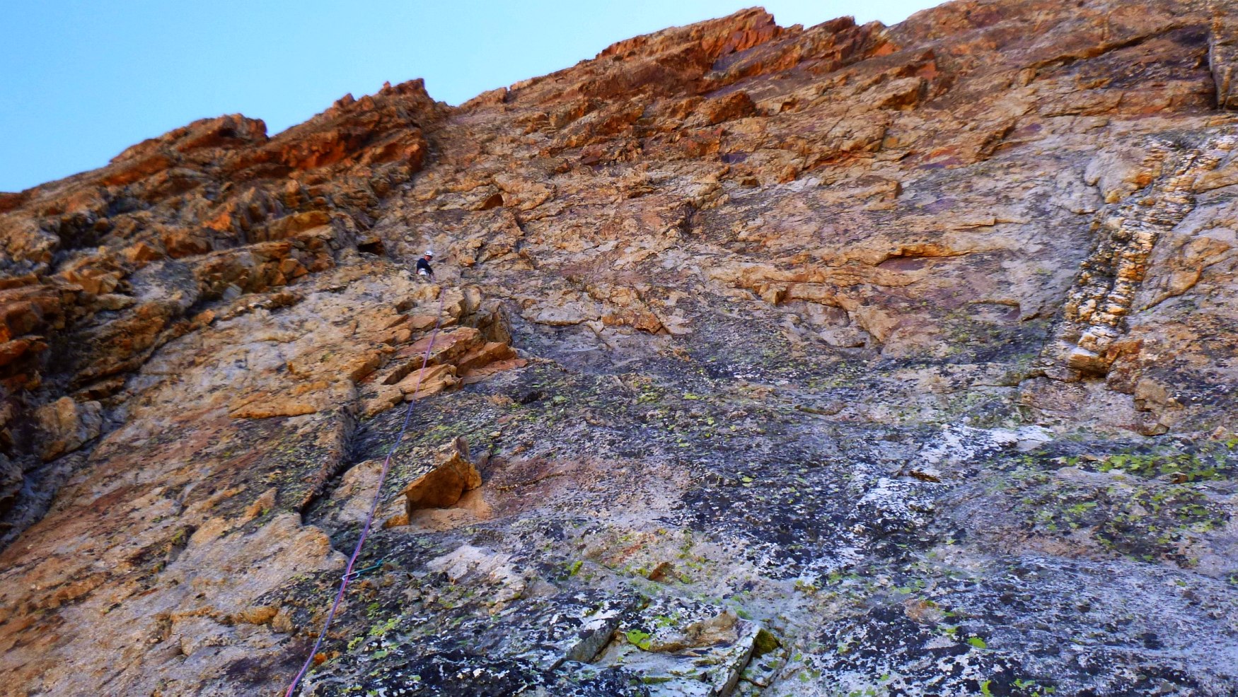 Escalade face Ouest tête du Rouget, voie Centrale Parat, TD- non équipée. Denis Corpet et Noël Dupré la Tour, 4 aout 2017. Refuge du Soreiller, les Etages, Massif des Ecrins Oisans, Isère, France