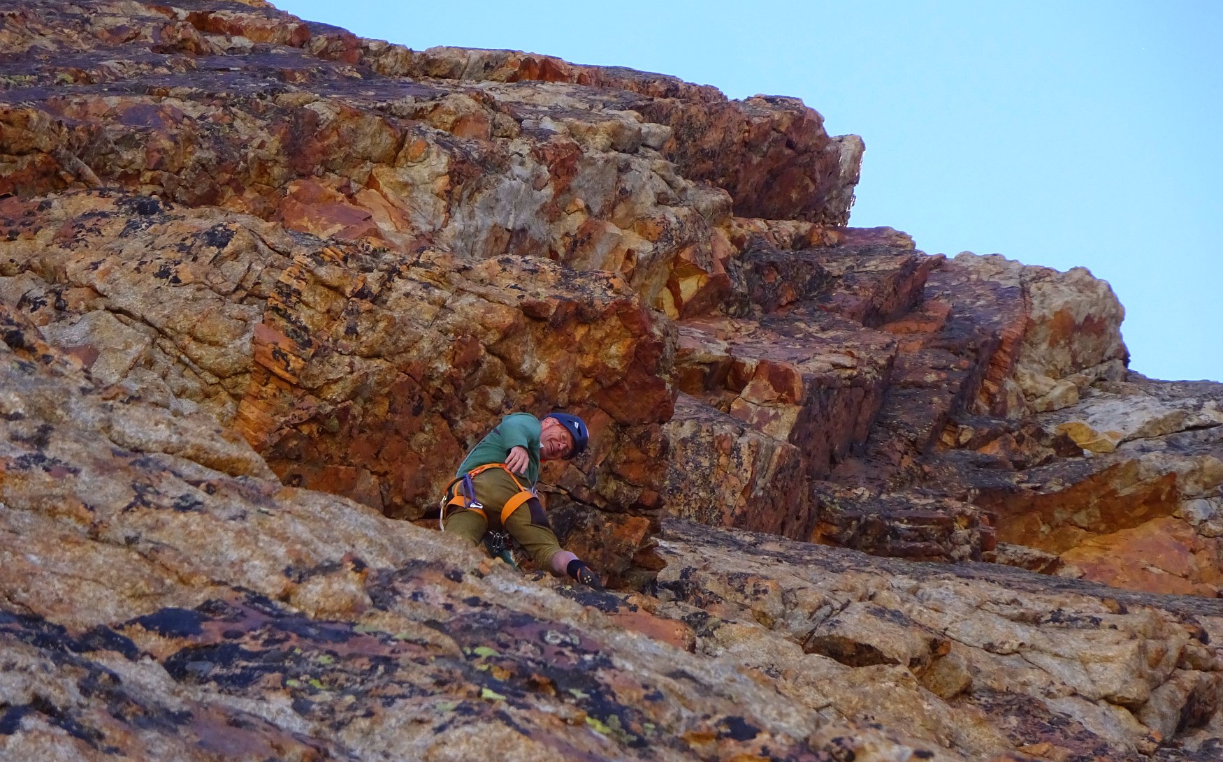 Escalade face Ouest tête du Rouget, voie Centrale Parat, TD- non équipée. Denis Corpet et Noël Dupré la Tour, 4 aout 2017. Refuge du Soreiller, les Etages, Massif des Ecrins Oisans, Isère, France