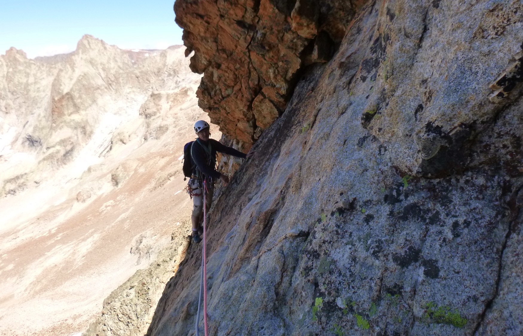 Escalade face Ouest tête du Rouget, voie Centrale Parat, TD- non équipée. Denis Corpet et Noël Dupré la Tour, 4 aout 2017. Refuge du Soreiller, les Etages, Massif des Ecrins Oisans, Isère, France