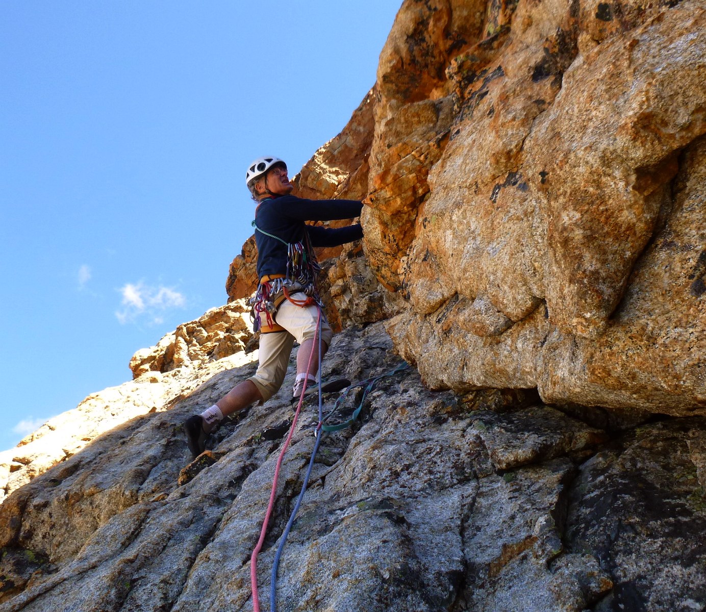 Escalade face Ouest tête du Rouget, voie Centrale Parat, TD- non équipée. Denis Corpet et Noël Dupré la Tour, 4 aout 2017. Refuge du Soreiller, les Etages, Massif des Ecrins Oisans, Isère, France