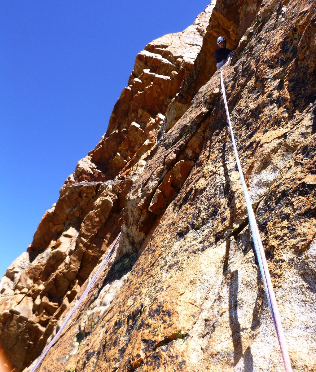 Escalade face Ouest tête du Rouget, voie Centrale Parat, TD- non équipée. Denis Corpet et Noël Dupré la Tour, 4 aout 2017. Refuge du Soreiller, les Etages, Massif des Ecrins Oisans, Isère, France