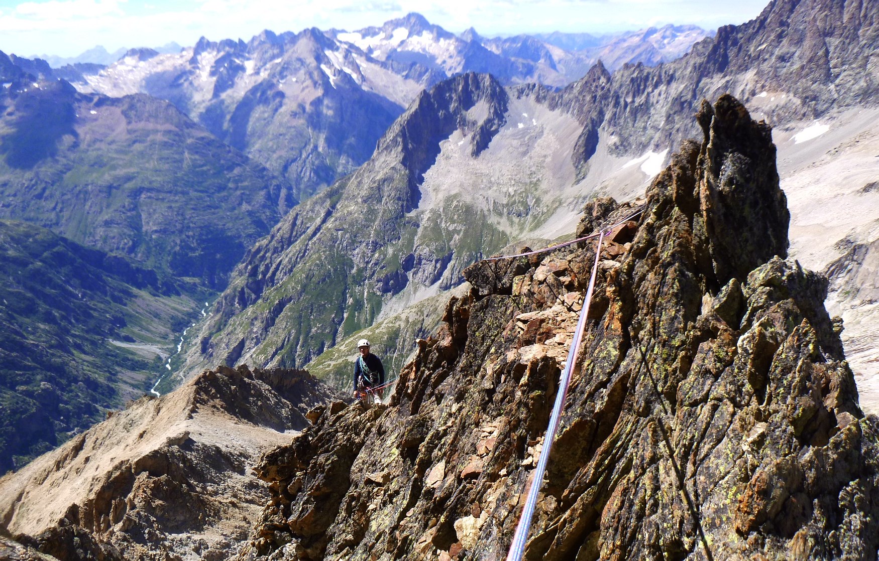 Escalade face Ouest tête du Rouget, voie Centrale Parat, TD- non équipée. Denis Corpet et Noël Dupré la Tour, 4 aout 2017. Refuge du Soreiller, les Etages, Massif des Ecrins Oisans, Isère, France