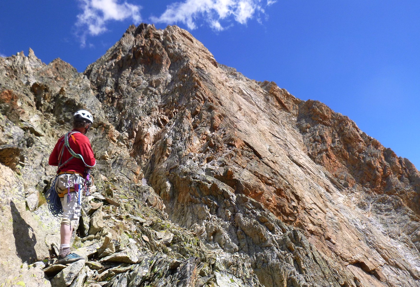Escalade face Ouest tête du Rouget, voie Centrale Parat, TD- non équipée. Denis Corpet et Noël Dupré la Tour, 4 aout 2017. Refuge du Soreiller, les Etages, Massif des Ecrins Oisans, Isère, France