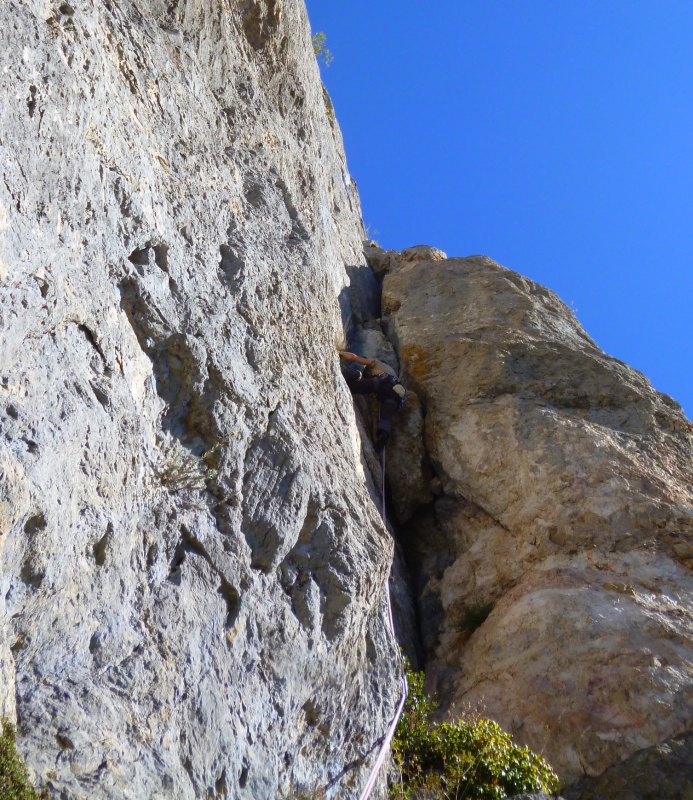 12 longueurs dont 5L en 6a et qq pas de 6b. Calcaire de rêve, dalles et dièdres, plein Sud