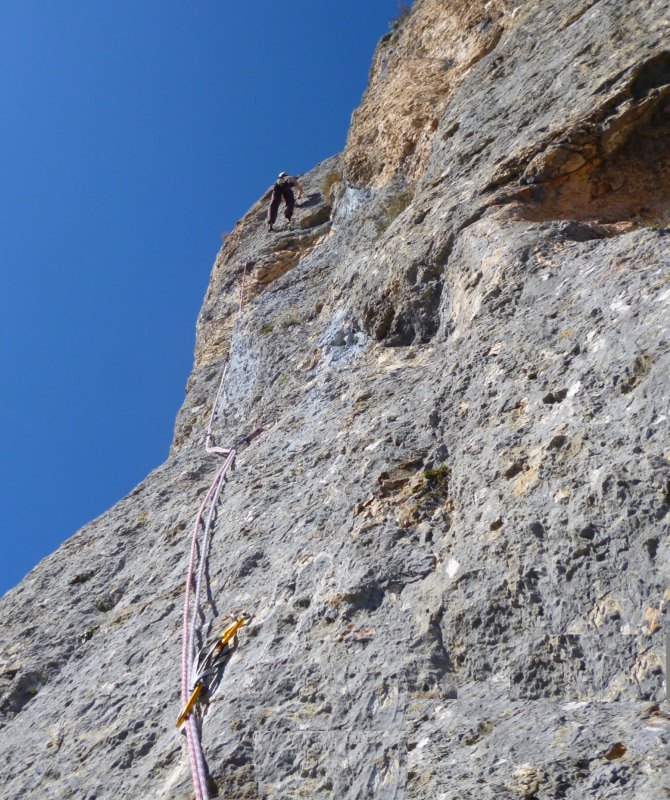12 longueurs dont 5L en 6a et qq pas de 6b. Calcaire de rêve, dalles et dièdres, plein Sud