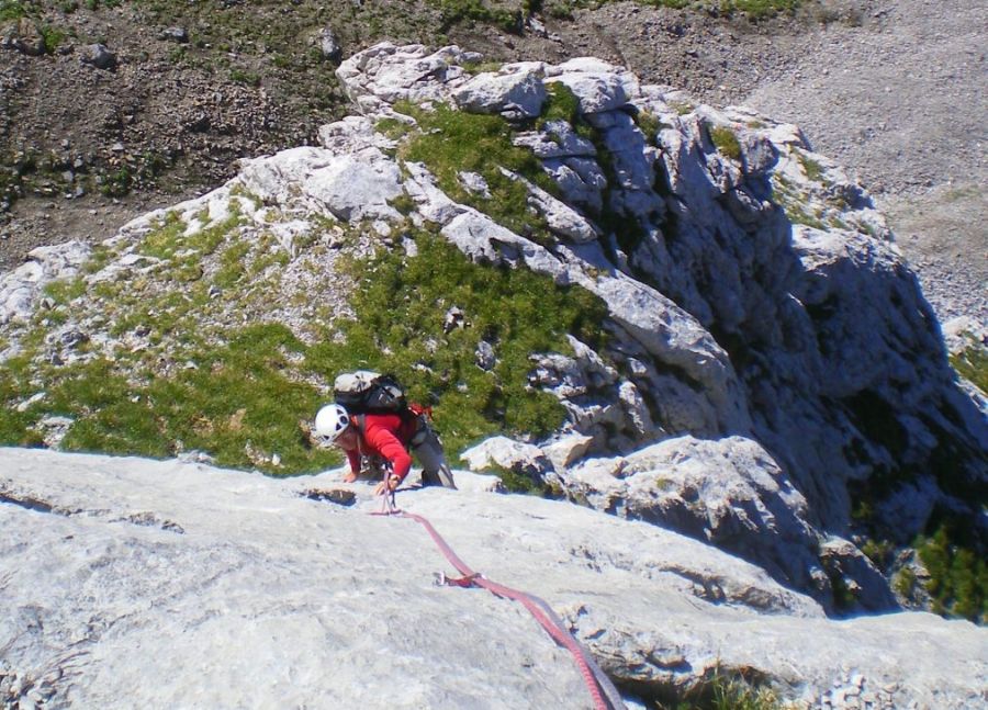Très belle voie au soleil sur un excellent calcaire. Des ressauts coupés par de belles plate-formes herbues. Equipement béton par Michel Piola (spits). Descente par un bon couloir herbu, après un rappel de 50m pour descendre "la bougie" finale, et un rappel de 45m en bas du couloir pour rejoindre les sacs laissés à l'attaque