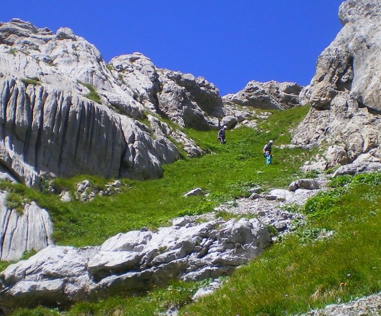 Très belle voie au soleil sur un excellent calcaire. Des ressauts coupés par de belles plate-formes herbues. Equipement béton par Michel Piola (spits). Descente par un bon couloir herbu, après un rappel de 50m pour descendre "la bougie" finale, et un rappel de 45m en bas du couloir pour rejoindre les sacs laissés à l'attaque