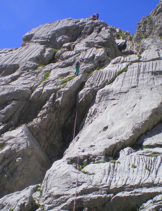 Très belle voie au soleil sur un excellent calcaire. Des ressauts coupés par de belles plate-formes herbues. Equipement béton par Michel Piola (spits). Descente par un bon couloir herbu, après un rappel de 50m pour descendre "la bougie" finale, et un rappel de 45m en bas du couloir pour rejoindre les sacs laissés à l'attaque