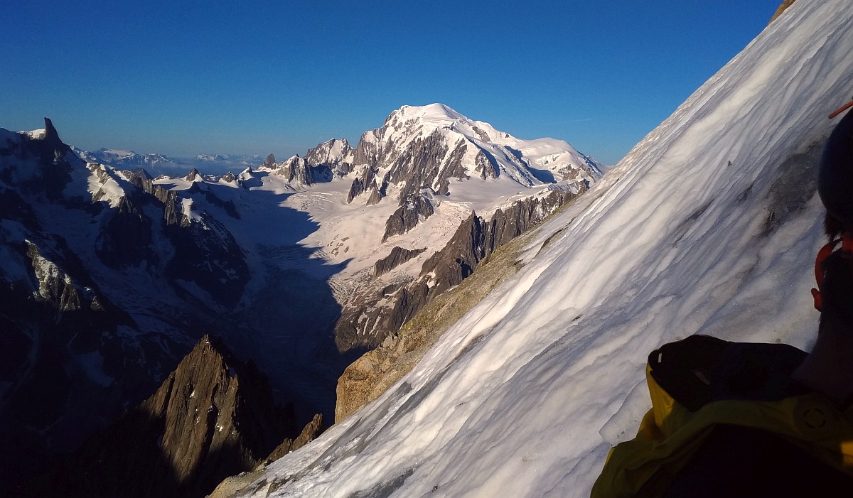 Cette arête m'avait semblé débonnaire en descendant de la Verte escaladée par l'arête Sans Nom avec Noel. En ce mois de Juin de canicule sur une arête couverte de neige foireuse, nous l'avons touvée difficile