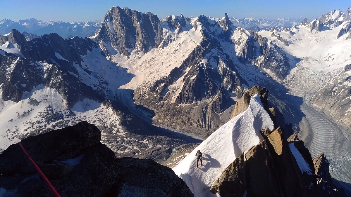 Cette arête m'avait semblé débonnaire en descendant de la Verte escaladée par l'arête Sans Nom avec Noel. En ce mois de Juin de canicule sur une arête couverte de neige foireuse, nous l'avons touvée difficile