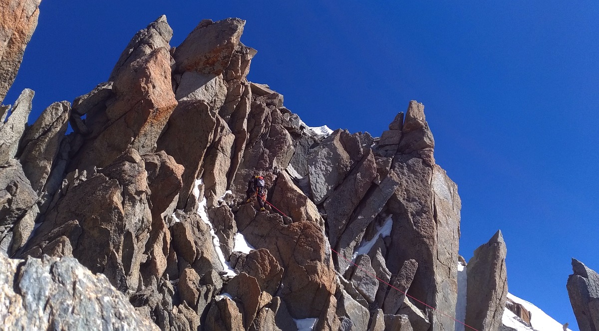 Cette arête m'avait semblé débonnaire en descendant de la Verte escaladée par l'arête Sans Nom avec Noel. En ce mois de Juin de canicule sur une arête couverte de neige foireuse, nous l'avons touvée difficile