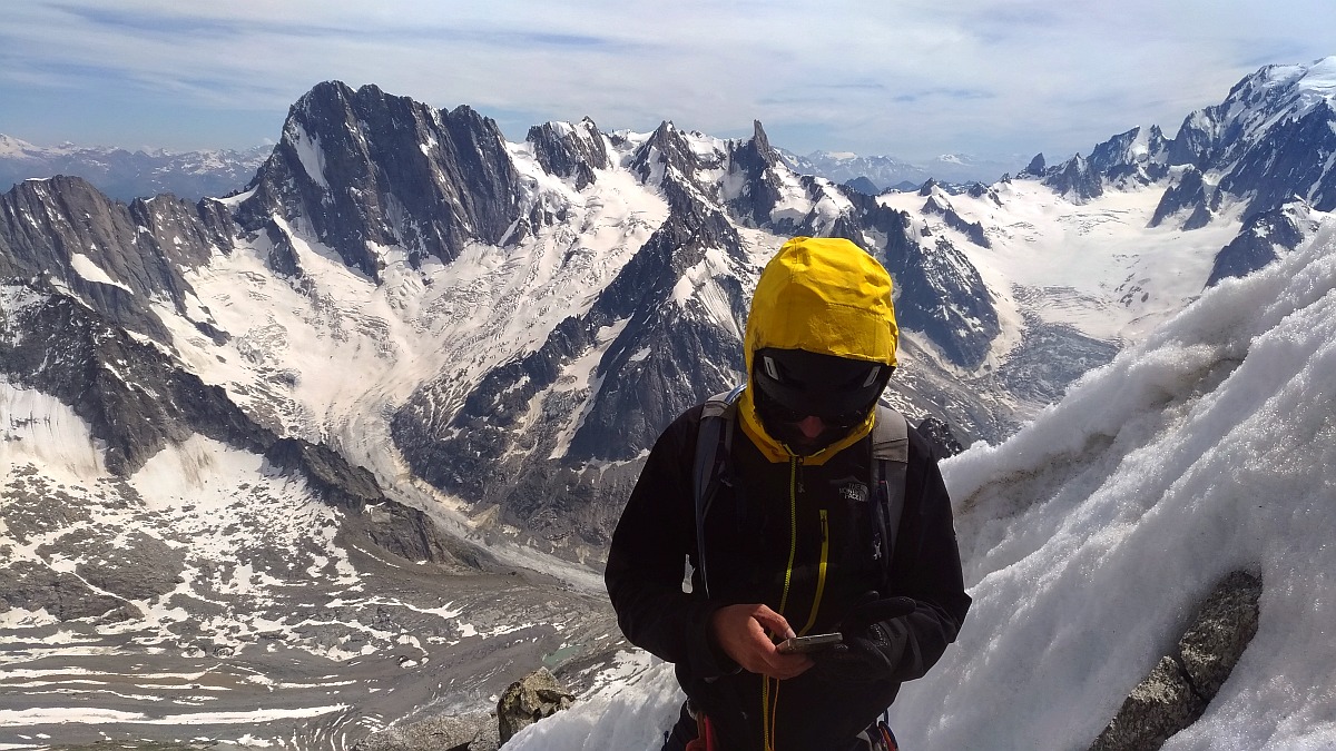 Cette arête m'avait semblé débonnaire en descendant de la Verte escaladée par l'arête Sans Nom avec Noel. En ce mois de Juin de canicule sur une arête couverte de neige foireuse, nous l'avons touvée difficile