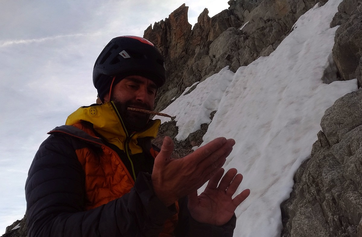 Cette arête m'avait semblé débonnaire en descendant de la Verte escaladée par l'arête Sans Nom avec Noel. En ce mois de Juin de canicule sur une arête couverte de neige foireuse, nous l'avons touvée difficile