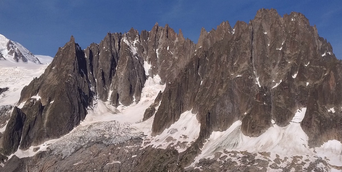 Cette arête m'avait semblé débonnaire en descendant de la Verte escaladée par l'arête Sans Nom avec Noel. En ce mois de Juin de canicule sur une arête couverte de neige foireuse, nous l'avons touvée difficile