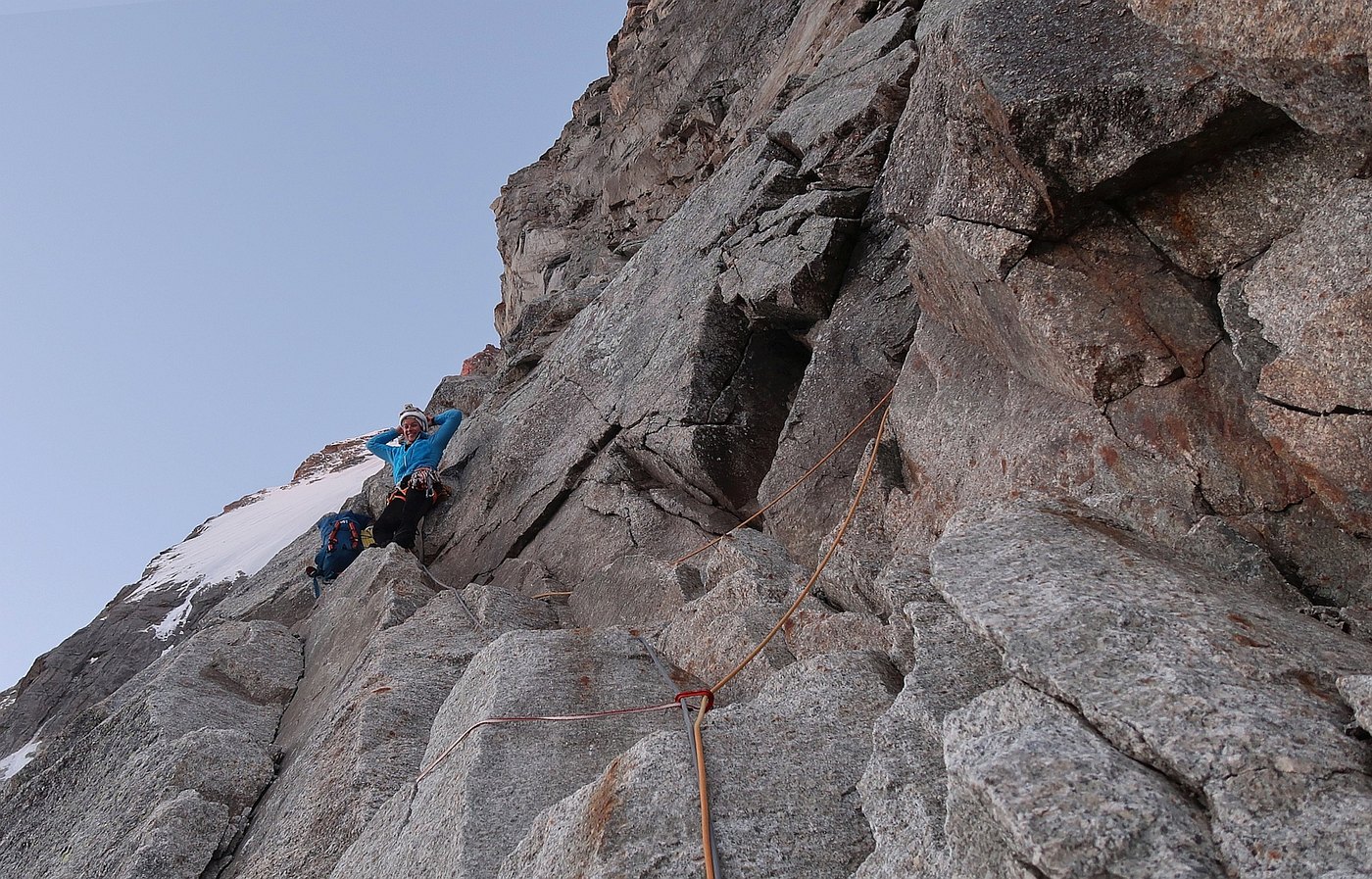 Climbing the Walker spur, Cassin route, in Grandes-Jorasses North Face.