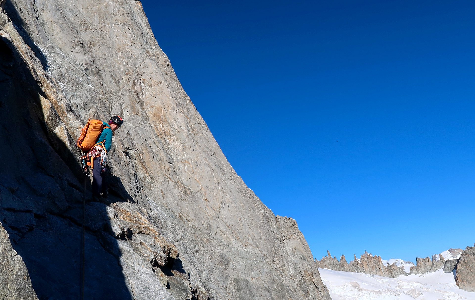Climbing the Walker spur, Cassin route, in Grandes-Jorasses North Face.
