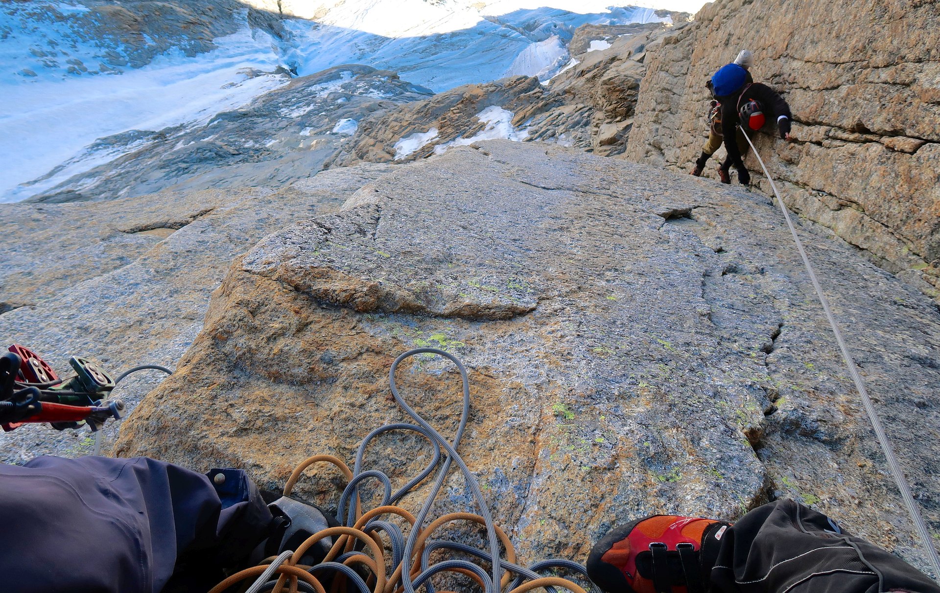 Climbing the Walker spur, Cassin route, in Grandes-Jorasses North Face.