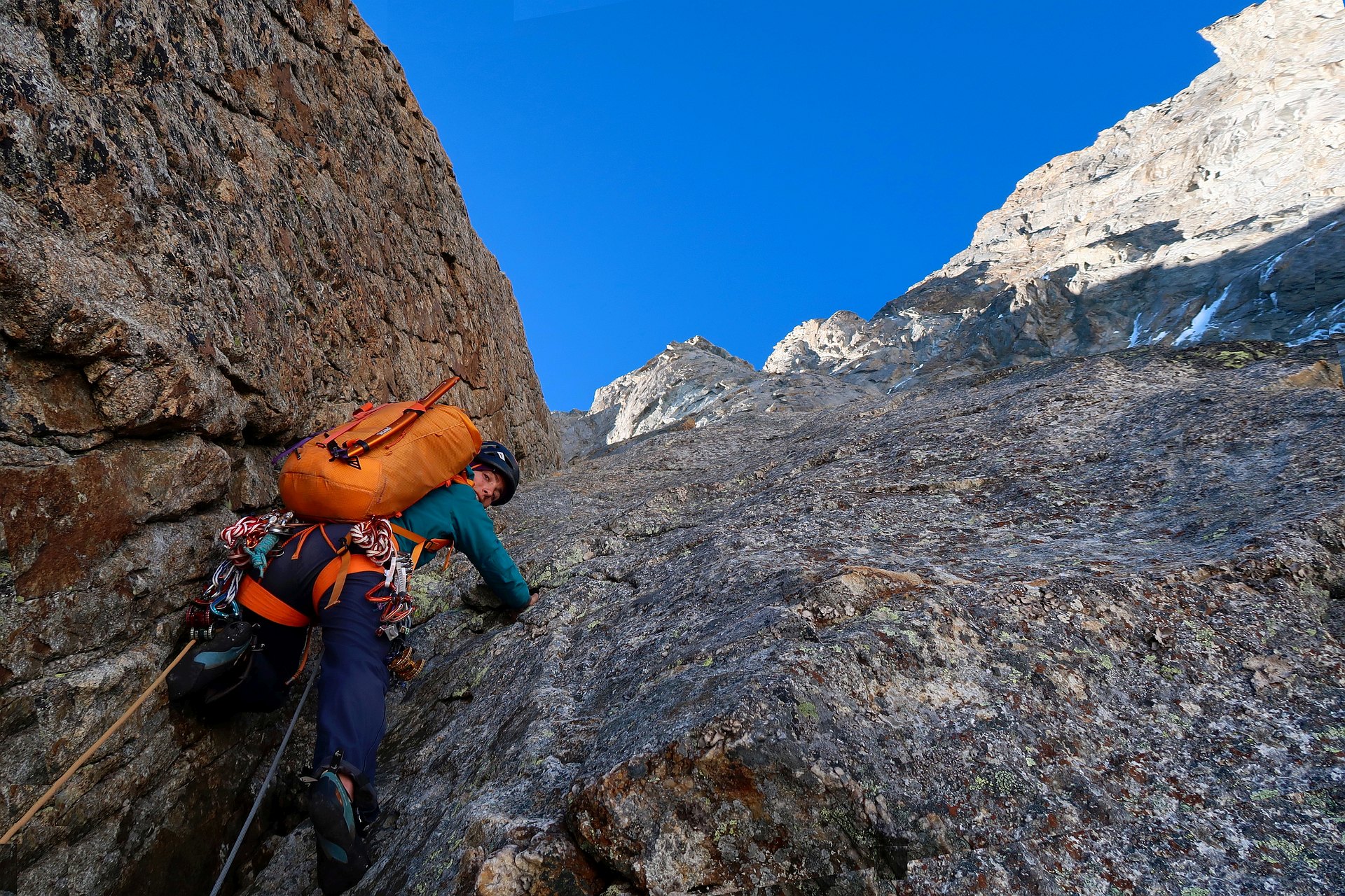Climbing the Walker spur, Cassin route, in Grandes-Jorasses North Face.