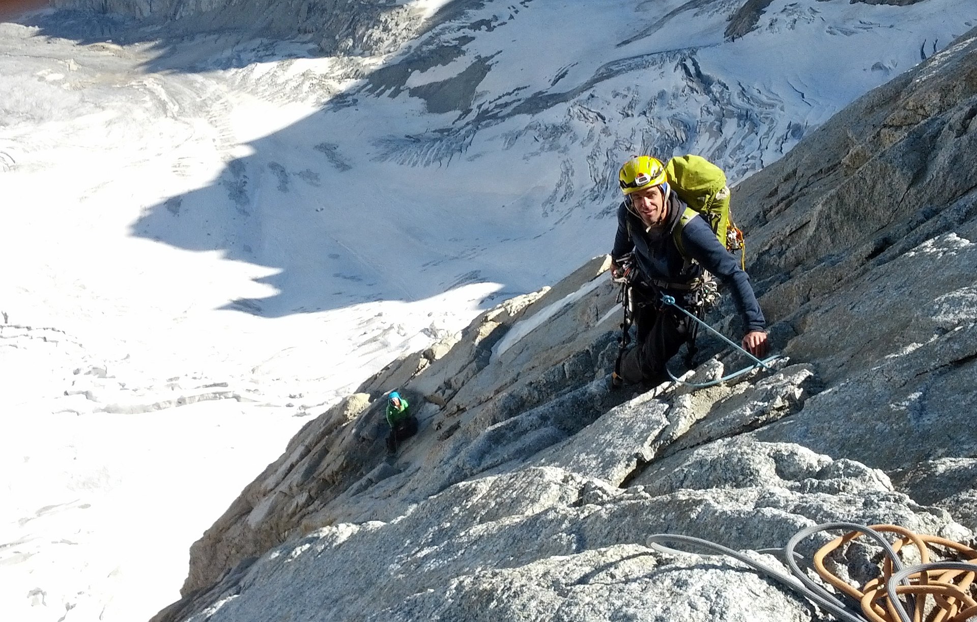 Climbing the Walker spur, Cassin route, in Grandes-Jorasses North Face.