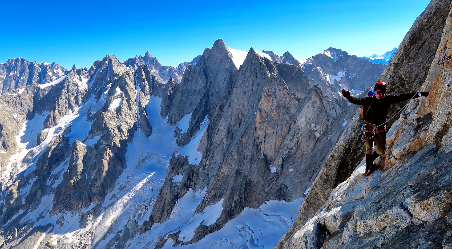 Climbing the Walker spur, Cassin route, in Grandes-Jorasses North Face.