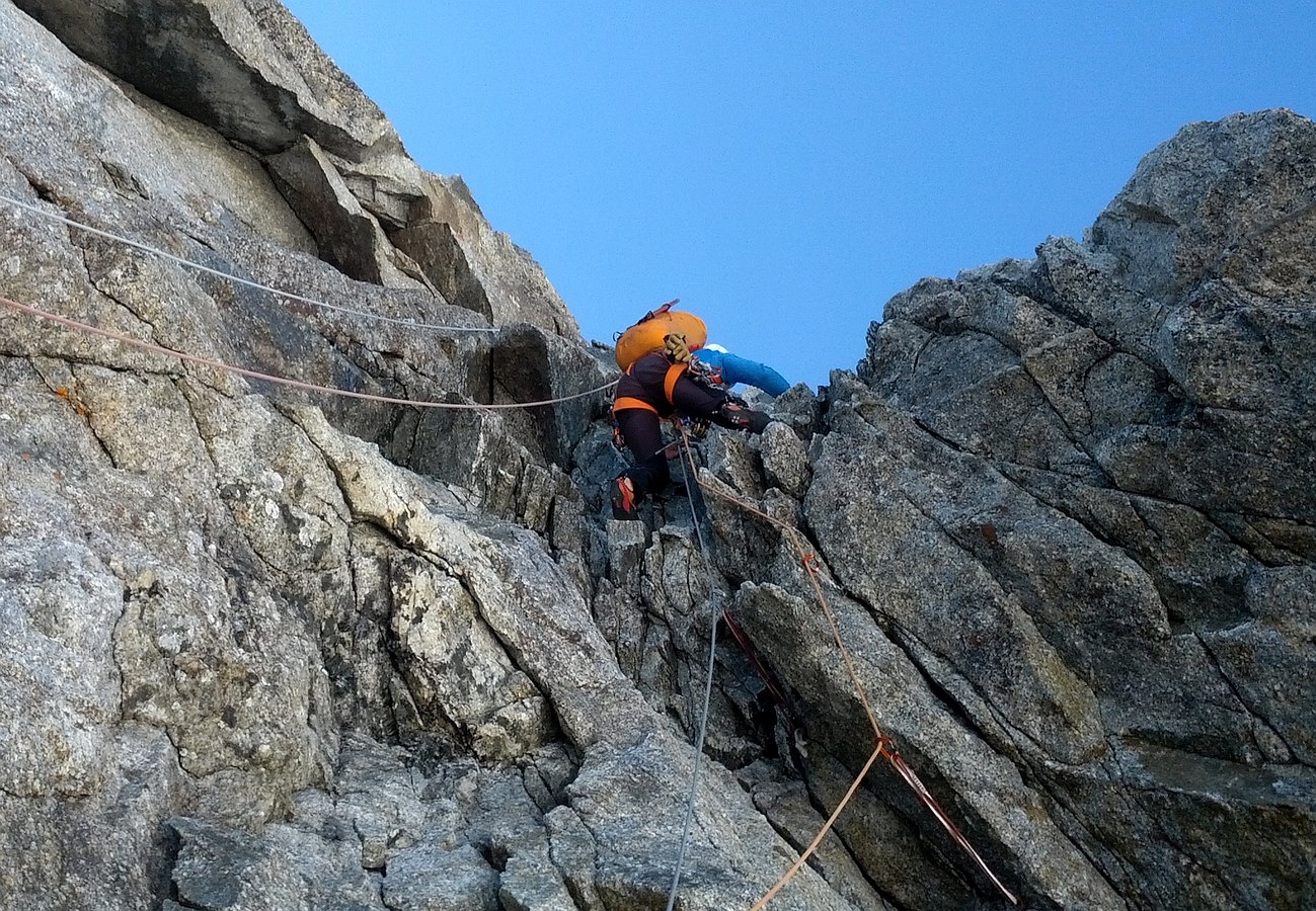 Climbing the Walker spur, Cassin route, in Grandes-Jorasses North Face.