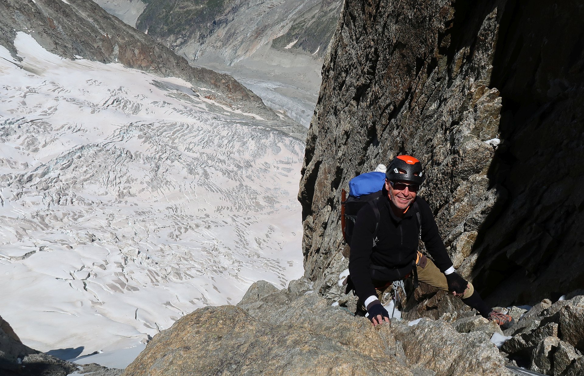 Climbing the Walker spur, Cassin route, in Grandes-Jorasses North Face.