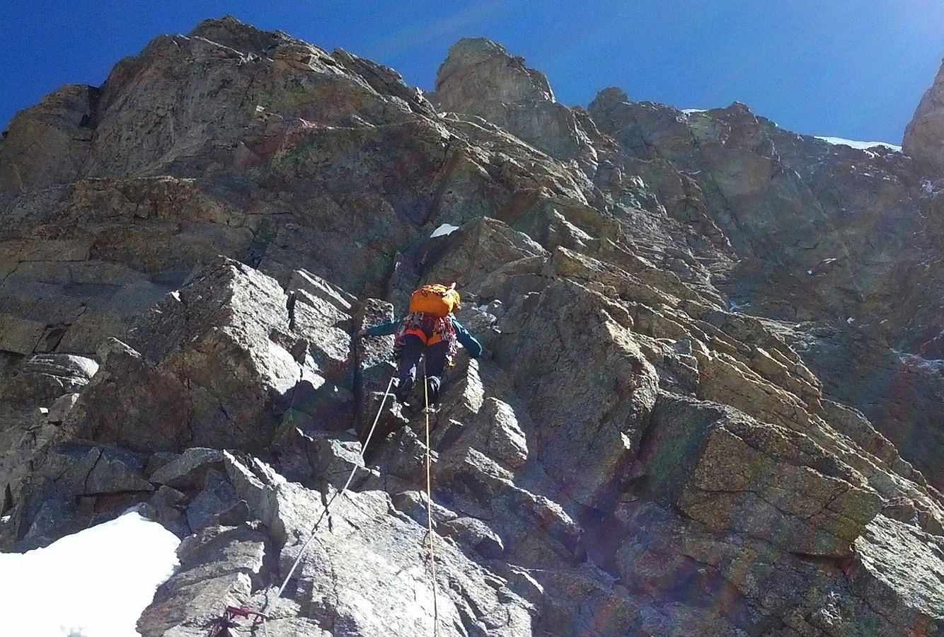Climbing the Walker spur, Cassin route, in Grandes-Jorasses North Face.