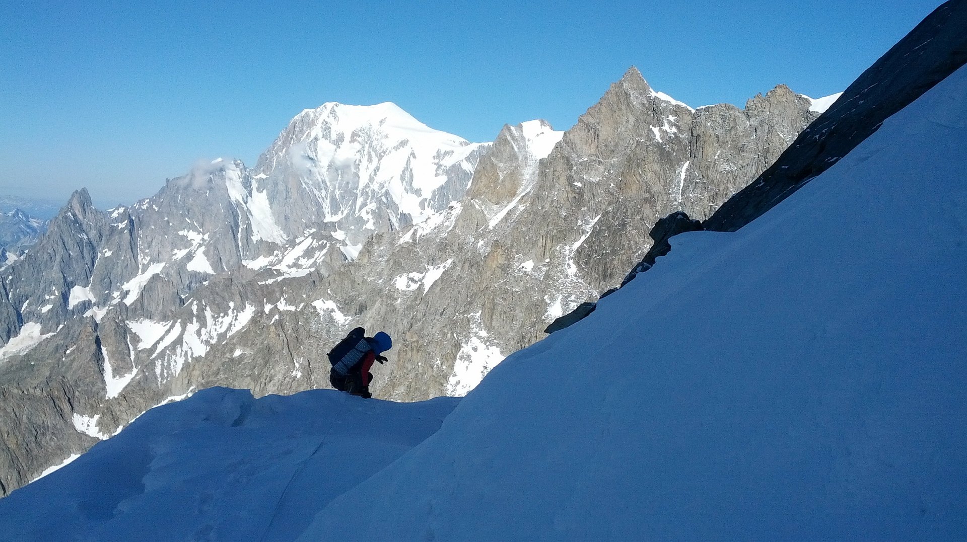 Climbing the Walker spur, Cassin route, in Grandes-Jorasses North Face.