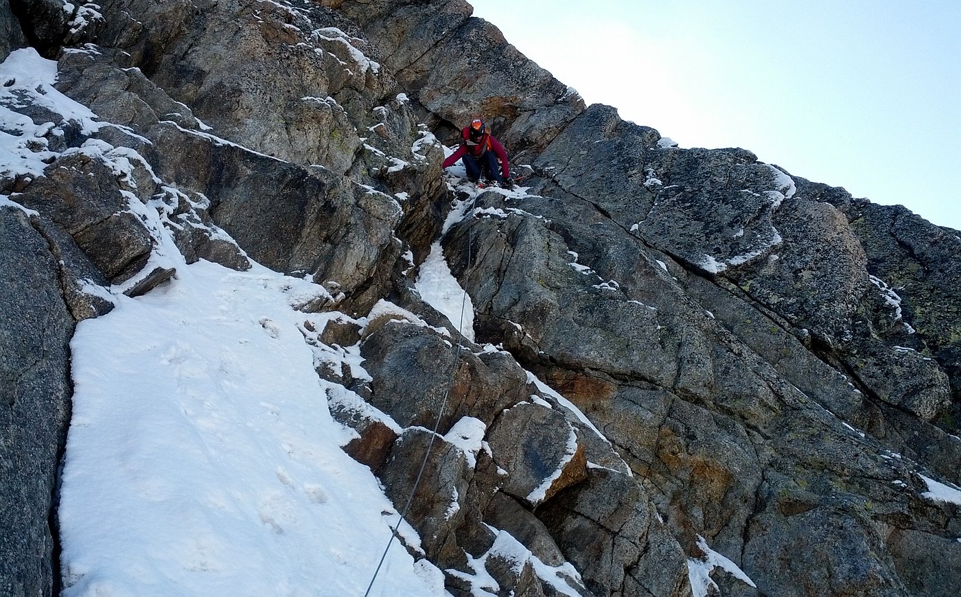 Climbing the Walker spur, Cassin route, in Grandes-Jorasses North Face.