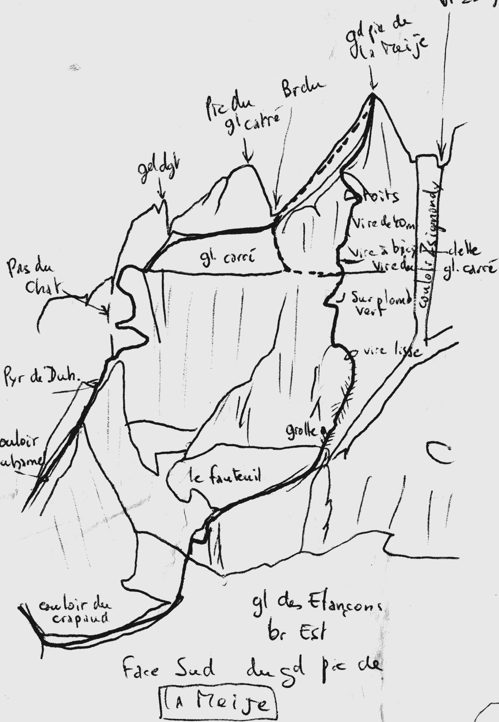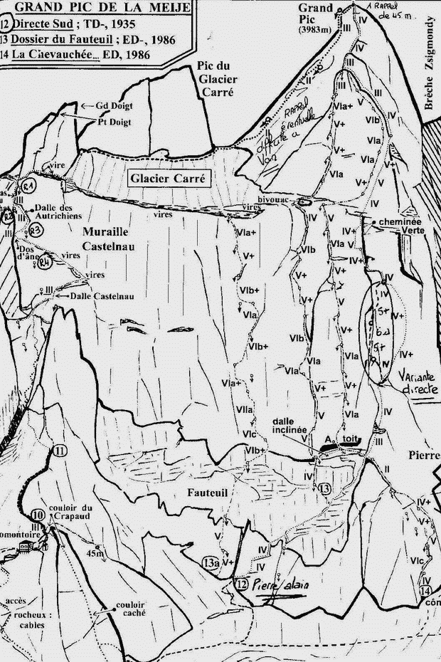 Vous voulez un lien, un seul ? Un "amant" fidèle de la face Sud de la Meije: Chapoutot. c'est drôle et c'est beau. Comme moi, il montre son topo "original", plié le grand jour dans la poche du futal, et longuement scruté pour chercher la voie !