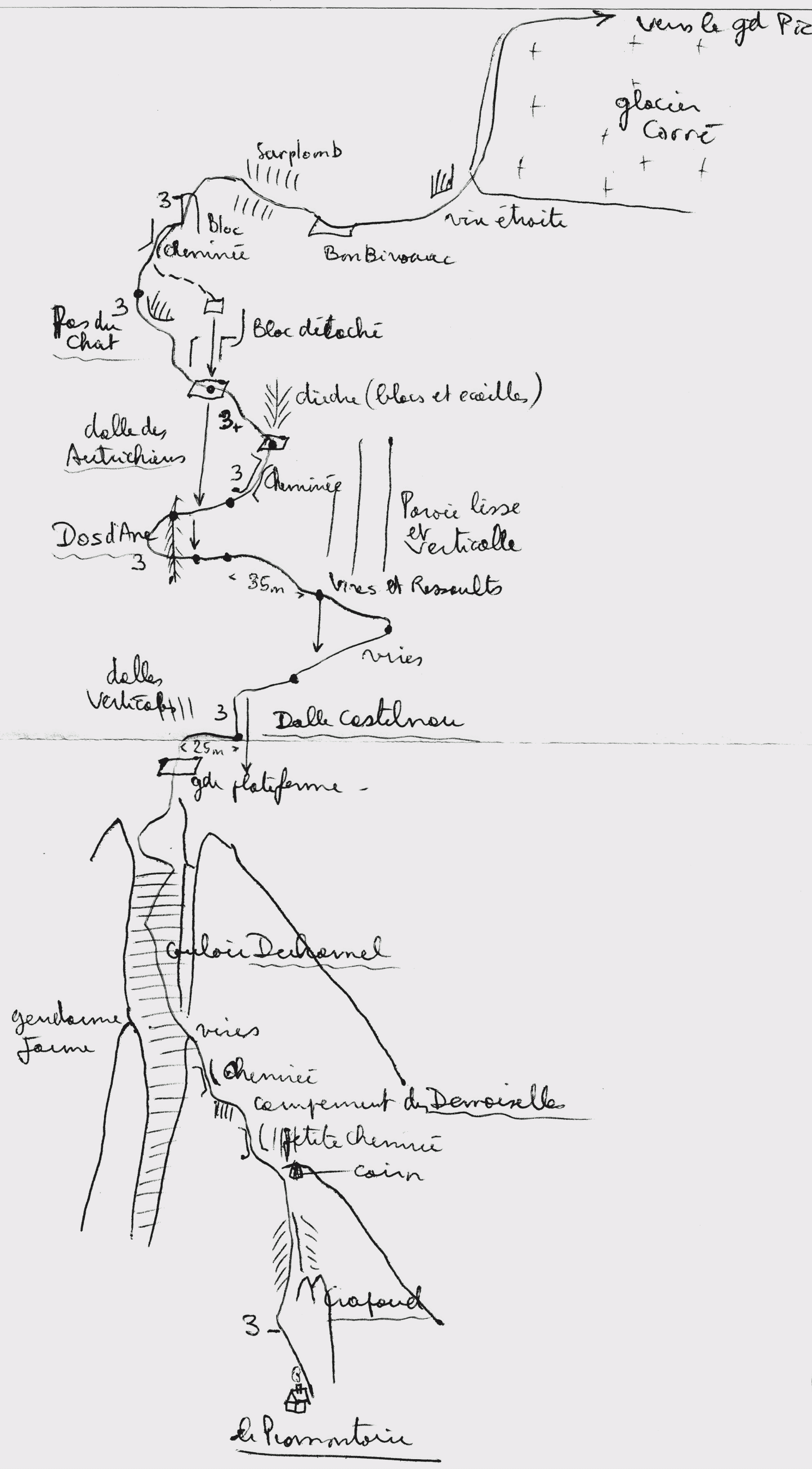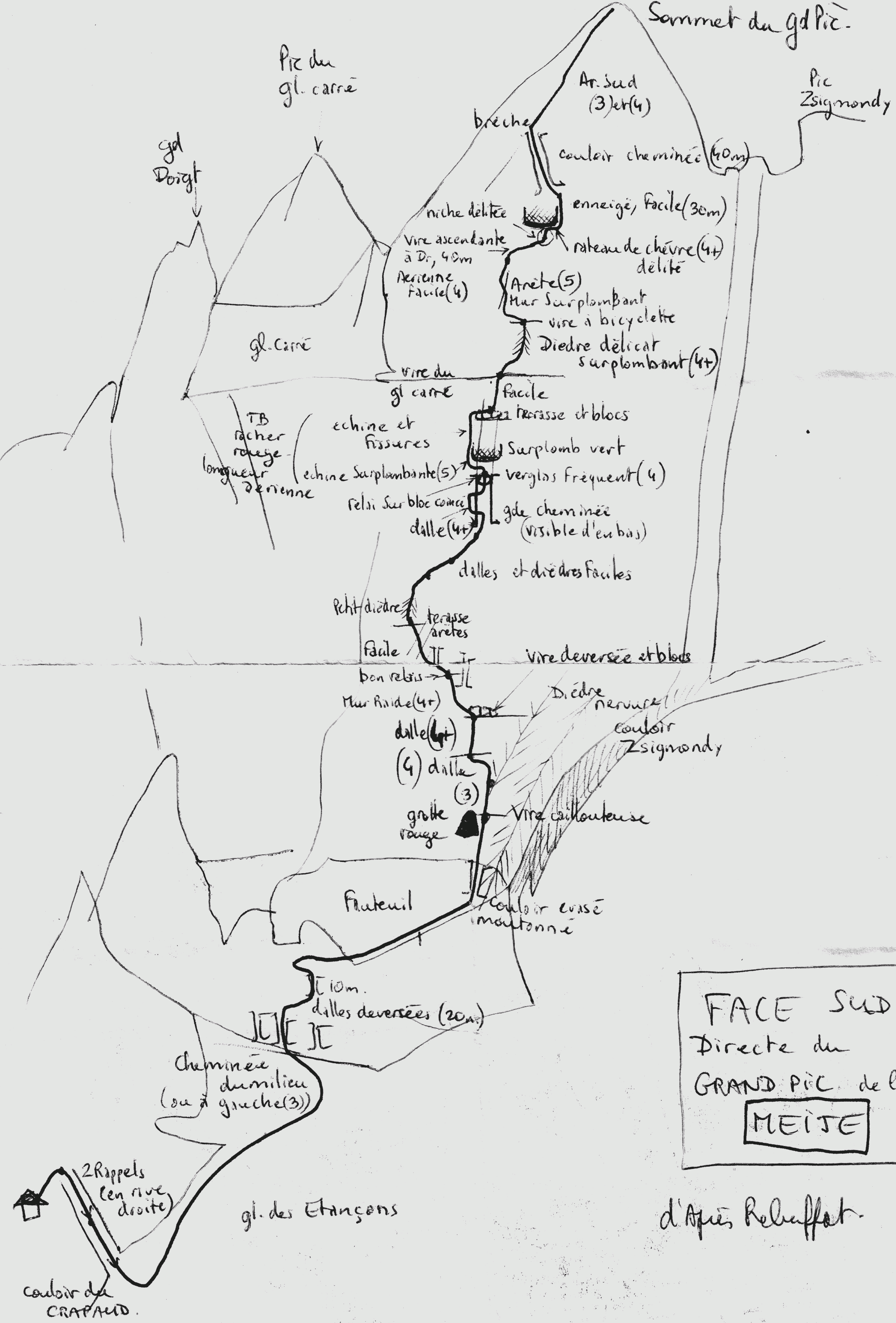 Avec Noël Dupré la Tour nous avons, contrairement à notre habitude, plutôt foncé ce jour là, et doublé pas mal de cordées (sauf un gars qui comprenait pas comment un Toulousain pouvait grimper ailleurs qu'à l'Ossau !). Pourtant c'était mal parti : la veille au soir, il neigeait. Et le matin, en bas du premier rappel du crapaud, je me suis aperçu que j'avais oublié mon piolet au refuge du Promontoire. J'ai foncé dans le noir le rechercher, et suis revenu dare-dare et tout en sueur. Du coup, j'ai crevé de soif tout du long. Aussi, nous avions innové avec une corde "à simple" nouée à une longue cordelette pour les rappels. Léger, mais pas très sécurit ! On avait peur "du pas dur", en fait pas dur. Par contre, c'est un peu paumatoire cette face, surtout au début(bas du dossier du fauteuil). Et en haut, c'est facile, mais long, et essouflant (on a grimpé longtemps corde tendue). Du sommet j'ai rapporté une petite pierre brun rouge, pour ma petite Meige, qui avait juste 5 mois et demi le jour du sommet ! Ci-joint, les topos face sud et voie normale, dessinés par Denis Corpet, photo/topo de http://nimp.crew.free.fr et topo de J.M. Cambon) (cliquer pour agrandir)