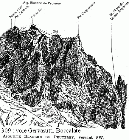 - Gugliermina (on the Blanche de Peuterey) Gervasutti-Boccalate route, F6a ED- 650m