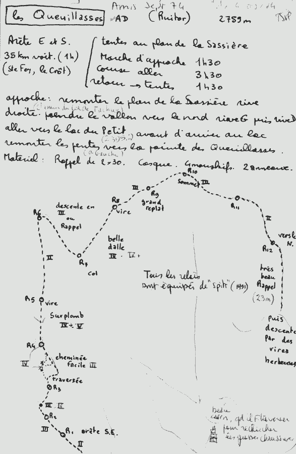 <= Cliquer le topo (1974!) pour l'agrandir. Les topos récents disent que c'est équipé de spits, et que les longueurs sont: /3/4c/4b/4a/5c/4a/ désescalade /5a/3/descente et rappel