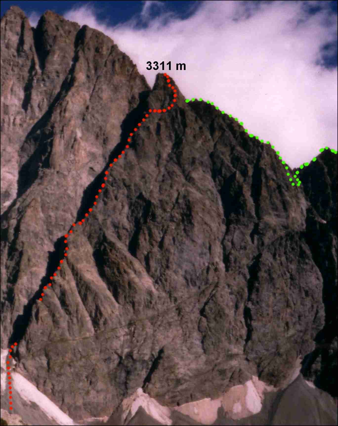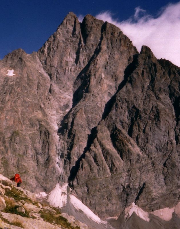Première par Narcisse Candau et deux autres, le 1 sept 1971, et jamais répétée d'après le "Guide Labande" (course n° 488). Le topo dit aussi que la voie n'est pas équipée, et demande 11 h 30 (approche 1h, escalade 8h, arêtes 2h30): effectivement, nous n'avons vu qu'UN clou (à l'attaque), et mis 11 h 45 du refuge au sommet. Le rocher est un gneiss rouge amphibolique à grain fin, qui se débite en gros "caramels" coupants (rappelle les Aiguilles Rouges, à Chamonix). Par endroit, on trouve de la quartzite blanche solide.
