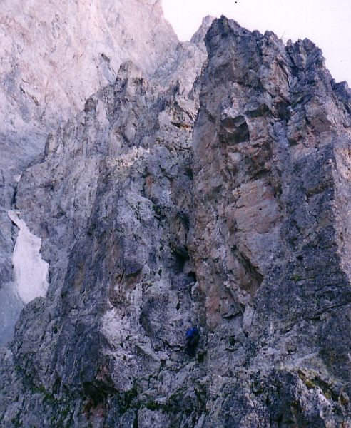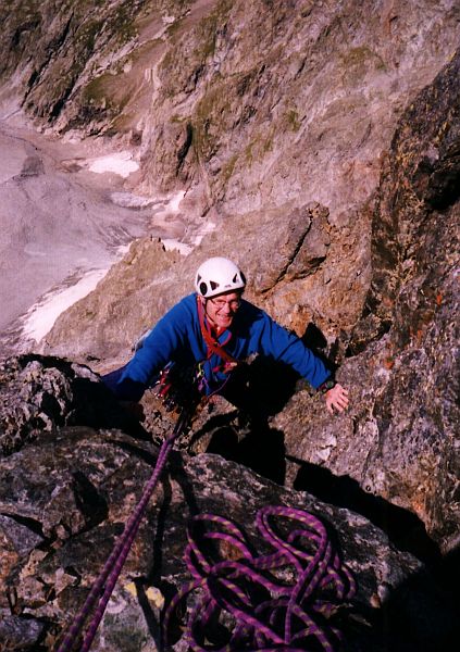 => Le 3ème ressaut commence par un "mini-ressaut" de 25m (III+), puis une arête horizontale en granite blanc, qui bute contre le 3ème ressaut proprement dit (relai à protéger par un piton lame). Traverser 10-15m vers la G (facile, mais pierreux), puis monter sur la dalle compacte mais facile, et revenir en biais à Dr vers le fil de l'arête, que l'on suit sur 5 longeurs en tout (III-IV, qq pas de IV+). Le Guide Labande dit qu'on contourne un gros surplomb par une traversée de 10m descendante vers la Dr, et un dièdre: on les a pas vus! Au sommet du 3ème ressaut, monter assez longtemps l'arête caillouteuse et facile, anneaux à la main.
