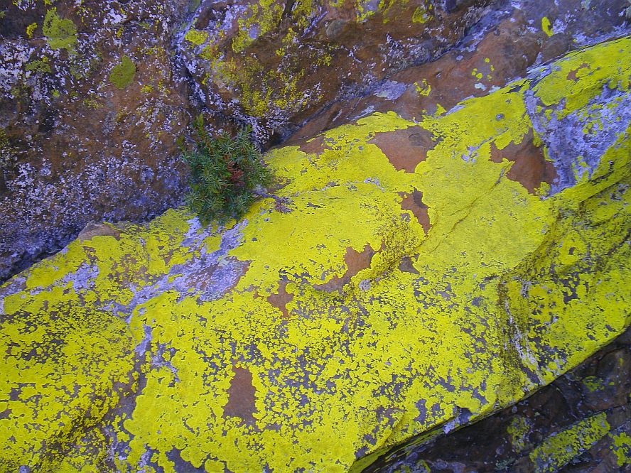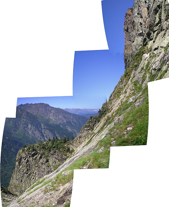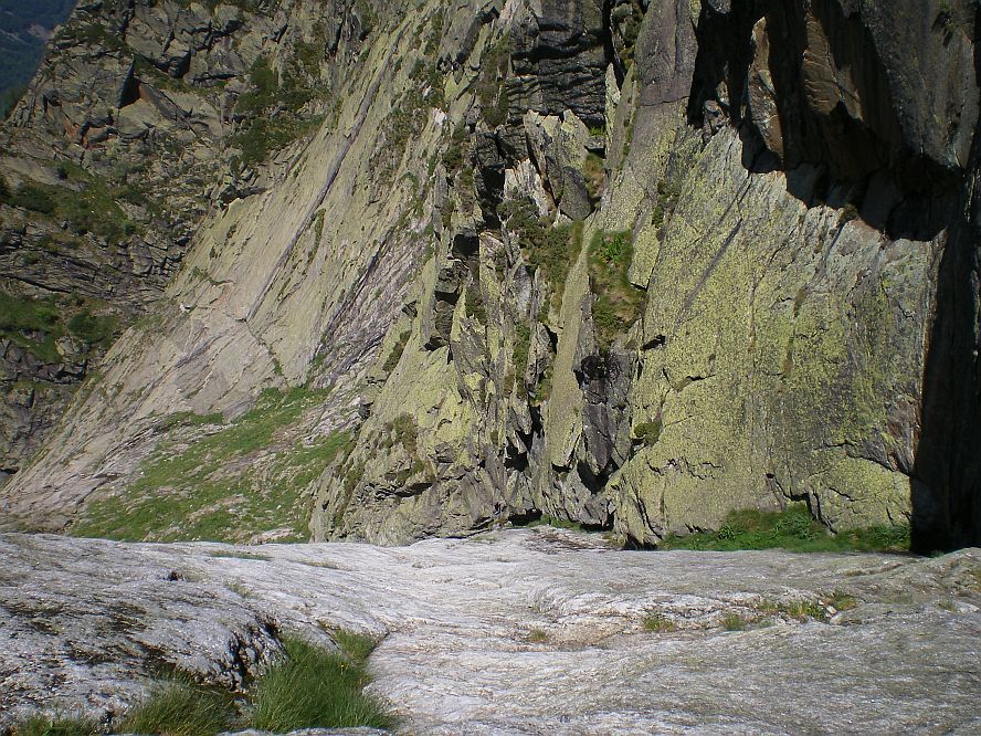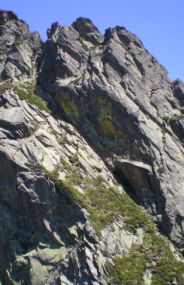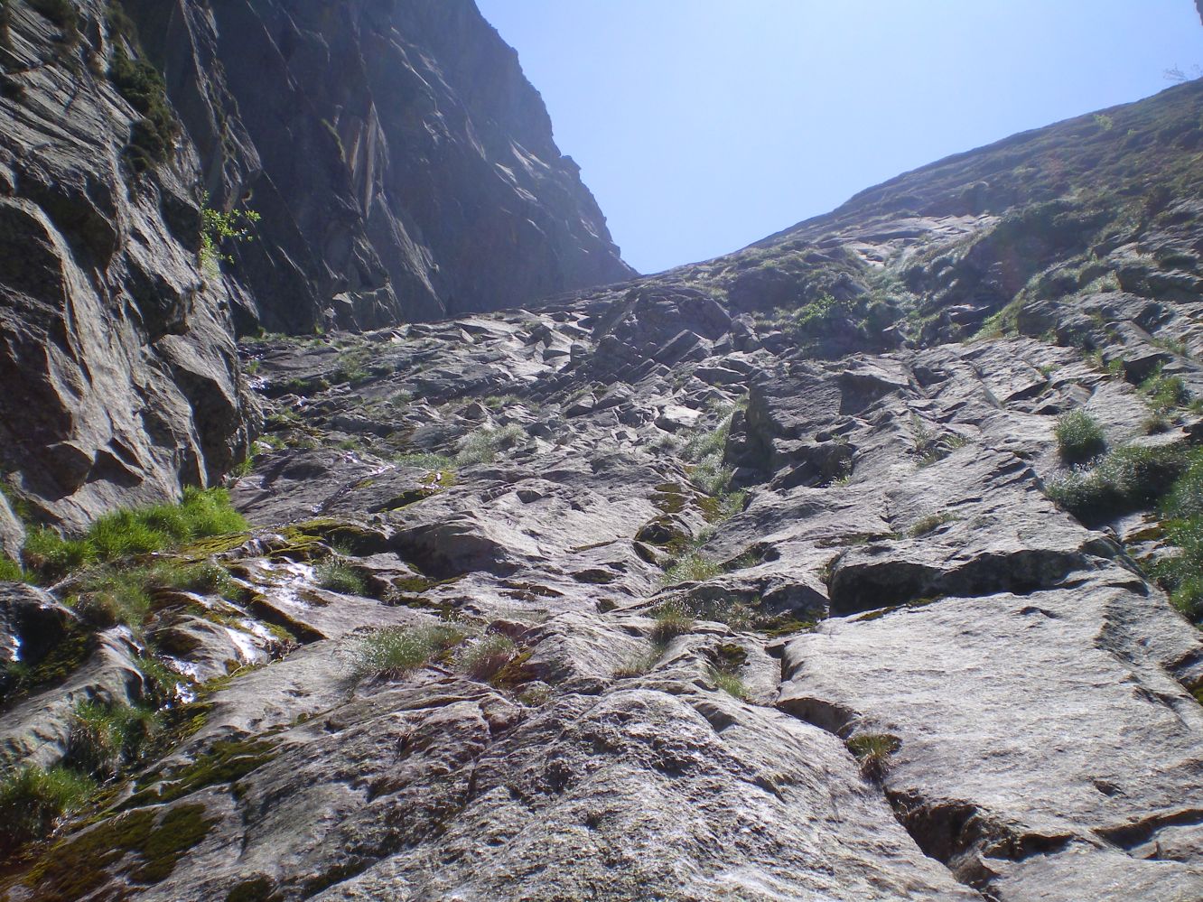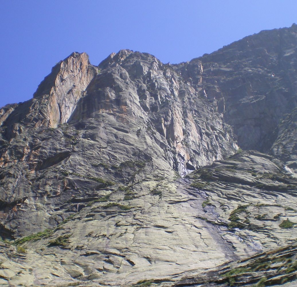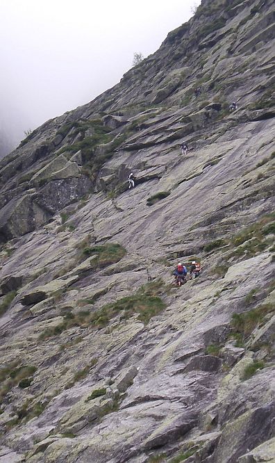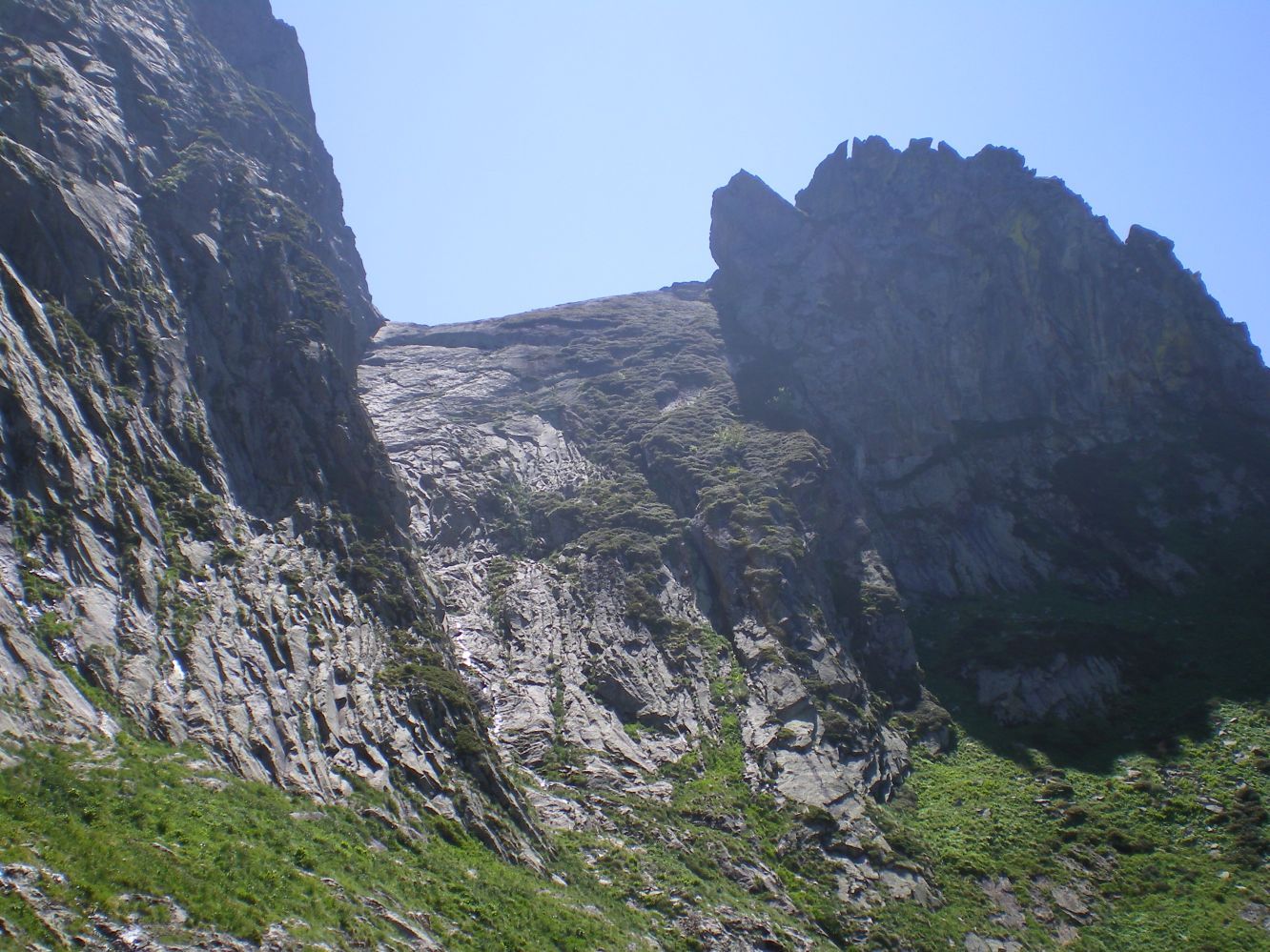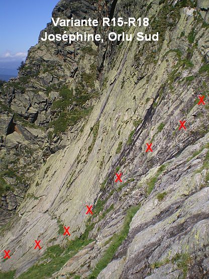 - Variante: après R15 j'ai obliqué le 23/06/07 vers la G pour continuer à monter 100-150m vers la grande paroi Sud. Cette Variante R15-R18 n'est pas équipée, et elle est plus raide et plus dure que la voie "normale" à droite. Il y a pas mal de 5, mais les trainées noires humides s'évitent bien. On rejoint des mini-vires herbeuses qui traversent à Dr, sous la face S, horizontalement vers R18. En se retournant on peut admirer l'immense arête S-W de la Dent